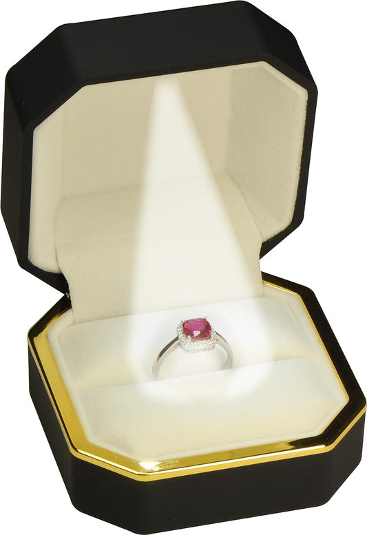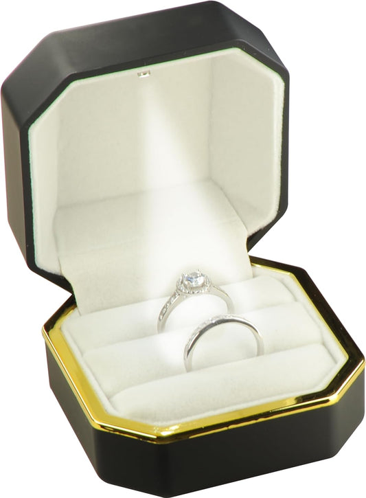The Jewellery Pak Black Ring Box for Proposal, Engagement, Wedding…Luxury Octagonal Design with Gold Trim LED Ring Jewelry Gift Holder Box with Light for Men for Women