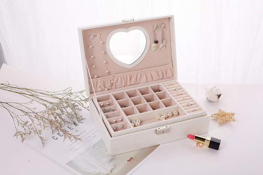 White Color 2 Layer Luxury Jewelry Organizer Case Box Premium PU Leather Exterior and Soft Touch Velvet Interior Jewelry Storage Display Box with Lock with Beautiful Heart Shaped Mirror Perfect Jewelry Gift Box for Women for Girls Box