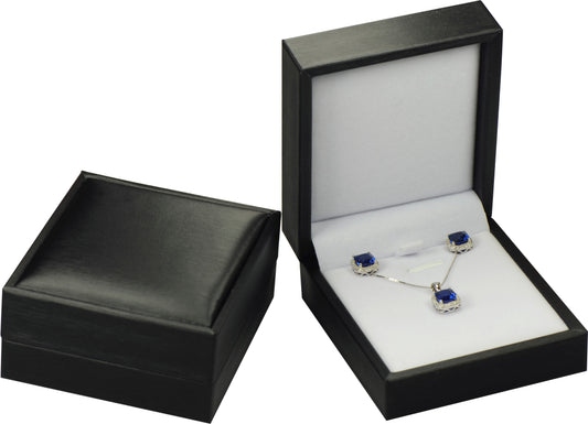 Wholesale Bulk Black Earring Necklace Pendant Set Jewelry Gift Packaging Display Storage Box Premium Soft Touch PU Leather Exterior Material Pure White Velvet Interior Size 2.5〞(W)*2.5〞(D)*2〞(H)