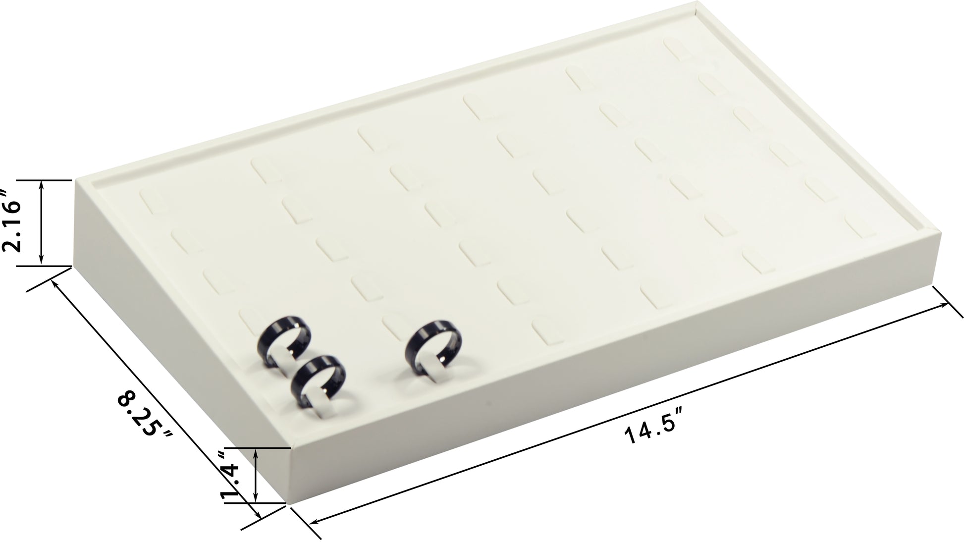 - WHITE COLOR PU LEATHER exterior compliments this ring display holder tray for any color of jewelry designs and makes your jewellery look luxury and gorgeous when you use the tray in stores and trade shows.Larger ring display tray perfect for bigger mens ring presentation and storage.