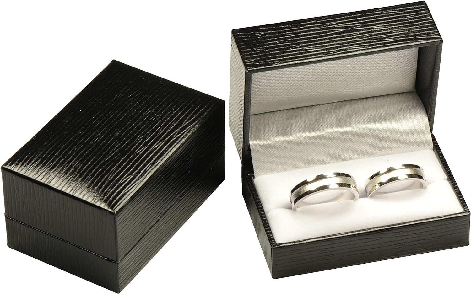 Black Double Ring Box Luxury Textured Leatherette Exterior & Satin Top Material Couple Jewelry Gift Holder for Wedding, Proposal, Engagement, 3(W)x2(D)x1.6(H) inch